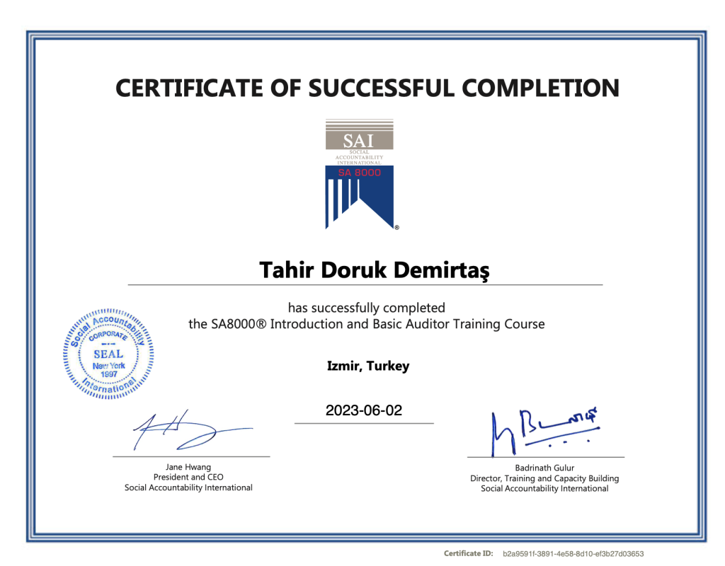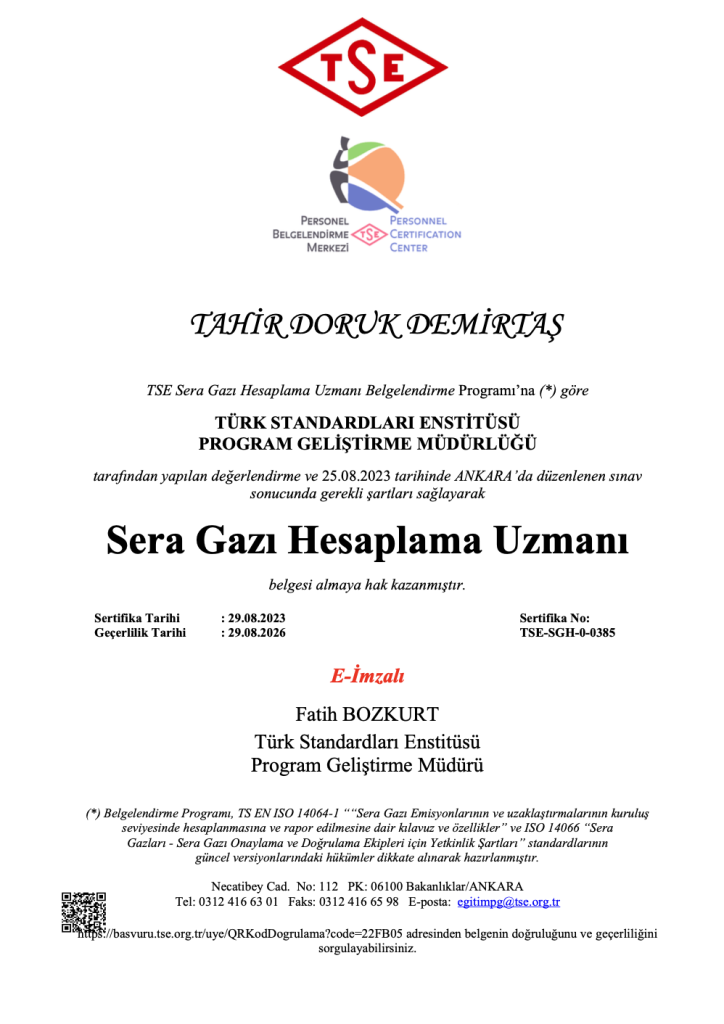 Sürdürülebilirlik ve denetim süreçlerinde en yüksek standartları sağlamak için uluslararası geçerliliğe sahip sertifikalara sahibiz. İşletmelerin çevresel ve sosyal uygunluklarını artırmalarına yardımcı olurken, en güncel ve güvenilir metodolojileri kullanıyoruz.